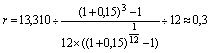 Размер долга по займу (10 млн. рублей) был задан как условие предыдущего примера. На самом деле, часто данный параметр также является вычисляемой величиной, т.к. наряду с основной суммой займа должник обязан выплачивать проценты по нему. Предположим, что 10 млн. рублей – это основная задолженность по облигационному займу, кроме этого необходимо ежегодно выплачивать кредиторам 10% основной суммы в виде процентов. Чему будет равна сумма ежемесячного взноса в погасительный фонд с учетом процентных выплат по займу? Так как проценты должны выплачиваться ежегодно и их годовая сумма составит 1 млн. рублей (10 млн. рублей * 10%), нам опять следует рассчитать член ренты r (R / 12) по ренте сроком n = 1 год, p = 12, m =1, i = 15%. По базовой формуле (6) его величина составит: