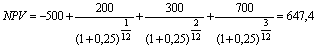 Под процентной ставкой i (в данном случае ее называют ставкой сравнения) понимается годовая сложная эффективная ставка декурсивных процентов. Срок операции n в общем случае измеряется в годах. Если же реальная операция не отвечает этим условиям, т.е. интервалы между платежами не равны году, то в качестве единицы измерения срока принимаются доли года, измеренные как правило в месяцах, деленных на 12. Например, инвестиции в сумме 500 тыс. рублей принесут в первый месяц 200 тыс. рублей дополнительного дохода, во второй 300 тыс. рублей и в третий – 700 тыс. рублей. Ставка сравнения равна 25%. Чистая приведенная стоимость данного проекта составит 1 млн. 147 тыс. руб.:
