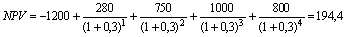 О достоинствах и особенностях чистой приведенной стоимости будет очень подробно говориться в последующих главах. Остается только заметить, что значение ее для финансового менеджмента настолько высоко, что многократно окупает затраты труда по изучению и осмыслению всех вышеприведенных формул финансовых вычислений. Вторым столь же важным финансовым показателем является внутренняя норма доходности (IRR – от английского internal rate of return). Рассмотрим еще один инвестиционный проект. Внедрение новой технологии требует единовременных затрат в сумме 1,2 млн. рублей. Затем в течение 4 лет предприятие планирует получать дополнительный денежный поток от этих инвестиций в размере: 1-й год – 280 тыс. рублей, 2-й год – 750 тыс. рублей, 3-й год – 1 млн. рублей и 4-й год – 800 тыс. рублей. Рассчитаем NPV этого проекта при ставке сравнения 30% годовых: