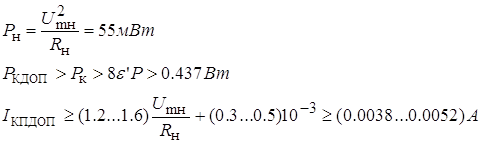 Рн = 13 Вт, Rн = 10 Oм. Транзистор выбираются по допустимой мощности рассеяния на коллекторе.