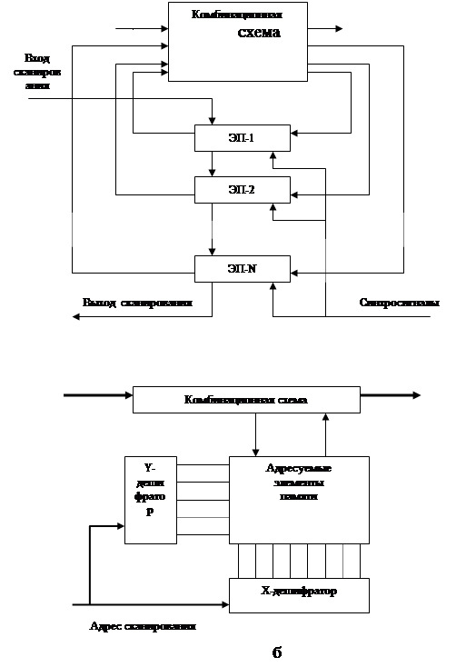 Для реализации такого подхода необходимы такие средства реконфигурации структуры последовательностной схемы, чтобы сигнал управления переключал все триггеры из рабочего режима в тестовый, при котором все триггеры становятся управляемыми и наблюдаемыми (рис.5, б). Наибольшее распространение среди этих методов получил метод сканирования **** осуществляемый за счет соединения специальных дополнительных элементов памяти в единый сдвиговый регистр, запоминающий внутренне состояние схемы. Сканирование дополнительных элементов памяти можно контролировать и путем адресации к ним и прямого выбора информации о состоянии схему из дополнительных ЗУ.