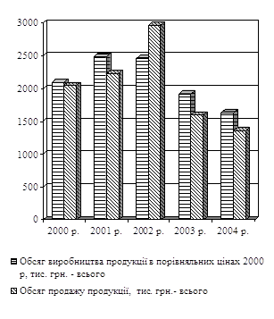 При цьому за останні п’ять років обсяг виробництва і реалізації продукції в рослинництві збільшувався не поступово, а зазнав значних коливань по рокам. Так за період з 2000 по 2003 рік обсяг виробництва і реалізації зростав, з 2003 по 2004 зменшувався і (рис. 2.1).