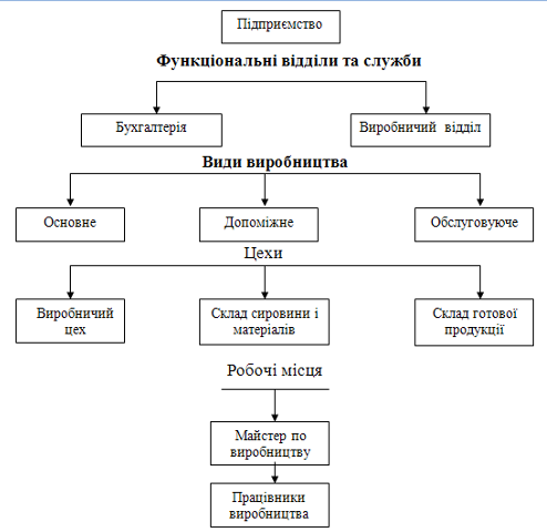Виробнича структура підприємства є основою для правильної організації управлінського обліку на підприємстві. Масштаб виробництва, складність технологічних процесів впливають на побудову виробничої структури підприємства (рис.1.2.).