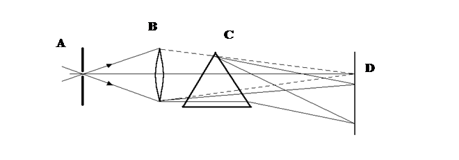 В дальнейшем Ньютон усовершенствовал свои наблюдения спектра, чтобы получить более чистые цвета. Ведь круглые цветные пятна светового пучка, прошедшего через призму, частично перекрывали друг друга. Вместо круглого отверстия использовалась узкая щель (А), освещенная ярким источником. За щелью располагалась линза (B), дающая на экране (D) изображение в виде узкой белой полоски. Если на пути лучей поместить призму (C), то изображение щели растянется в спектр, окрашенную полоску, переходы цветов, в которой от красного к фиолетовому подобны наблюдаемым в радуге. Опыт Ньютона изображен на рис.1