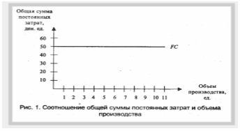 Постоянные издержки по своей экономической природе являются затратами на создание условий для конкретной деятельности. Это расходы по содержанию зданий, помещений, арендная плата, страховка, амортизационные отчисления и т.п. График постоянных затрат представлен на рис. 1.