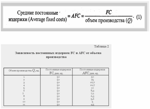 Если представить, что объем производства равен 1 ед., то постоянные издержки составляют (50:1) 50 ден. ед., при увеличении же производства до 10 ед., постоянные затраты на единицу продукции снижаются (50:10) до 5 ден. ед. (табл. 2).