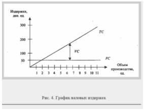 Расстояние между прямой постоянных затрат (FC) и прямой валовых затрат (ТС) – это сумма переменных затрат1.
