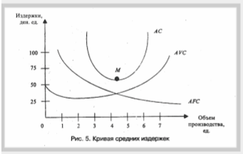 Этот вид издержек имеет особое значение для понимания рыночного равновесия, поскольку предприниматель стремится их минимизировать. Кривая средних издержек обычно имеет U-образную форму (рис. 5). Сначала средние издержки достаточно высокие. Это связано с тем, что большие постоянные издержки распределяются на незначительный объем продукции. По мере роста производства постоянные издержки приходятся на все большее число единиц продукции, и средние издержки быстро падают, доходят до минимума в точке М.