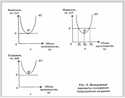 На рис. 6 показаны три возможных варианта положения предприятия на рынке. Если линия цены Р лишь касается кривой средних издержек AС в минимальной точке М (рис. 6а), то мы имеем дело с так называемой предельной фирмой. Она при данном уровне цен в состоянии покрыть лишь свои минимальные средние издержки, и ей безразлично, остаться в данной отрасли или нет. Точка М в данном случае является точкой нулевой прибыли.