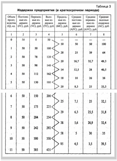 Для иллюстрации поведения альтернативных показателей издержек предприятия в краткосрочном периоде приведем условный пример. В табл. 3 представлены значения возможных объемов производства товара, данные о постоянных, переменных и валовых затратах, а также средних и предельных издержках.