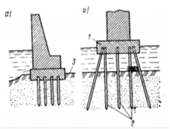 Свайний фундамент складається з трьох основних частин: (див. рис. 1.2.1) ростверка 1, сваї 2, і грунта 3. Ростверк опирається декілька свай, з'єднує їх і розподіляє на них навантаження. Розрізняють два типа свайних фундаментів: з низьким ростверком (рис1.2а), коли він заглиблюється в грунт до 0,5 своєї висоти, і з високим ростверком (рис1.2б), розміщеним вище рівня грунту.