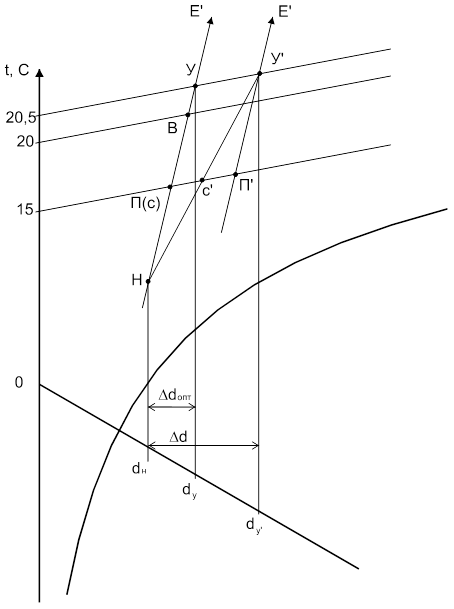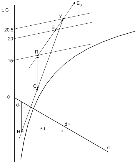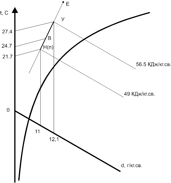Проводим луч процесса через точку У, получаем на пересечении с изотермами точки В и П. Из точки П по линии d=const опускаемся до пересечения с линией НУ, получаем точку С. количество рециркулирующего воздуха, GP, определяем: