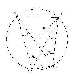 Обсервованные точки С1 и С2 лежат на окружности, вмещающей углы между линиями пеленгов Θ, так как величина этого угла не зависит от наличия и величины систематической погрешности. При вычитании