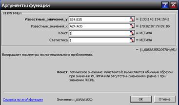 4. В главном меню выберите Вставка/функция. В окне Категория выберите Статистические, затем в окне Функция – ЛГРФПРИБЛ.