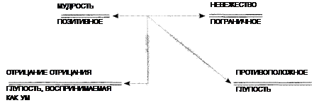 Невежество — это временная глупость, которая возникает в результате отсутствия информации, однако настоящая глупость необратима, и неважно, какой объем информации будет получен. Существует два вида отрицания отрицания: внутреннее, когда глупый человек считает себя умным, а тщеславие становится основой для создания многочисленных комических персонажей, и внешнее, в таком случае общество принимает глупого человека за умного, как в фильме «Будучи там» (Being There).