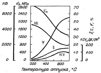На рис. 2.2.6 в качестве примера показано изменение механических свойств стали 45 в зависимости от температуры отпуска.
