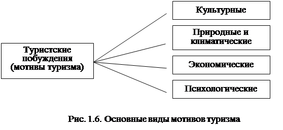 К этой категории принадлежат все внутренние мотивы туристов, посещающих места назначения. Эти мотивы обусловлены психологическими потребностями, которые испытывают туристы. Относительно немногие туристы путешествуют в дальние места назначения во второй раз, исключая случаи, если при этом присутствуют сентиментальные причины или сильный экономический мотив туризма. Необходимо заметить, что по мере увеличения доходов частных лиц психологические мотивы туризма оказывают большее влияние на выбор новых туристских мест назначения. На рис. 1.6 показаны основные мотивы туризма.