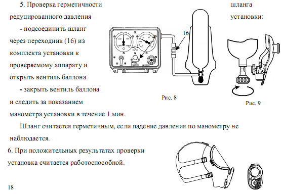 2.3.2.1. На установке КУ-9В проверку герметичности воздуховодной системы с легочным автоматом спасательного устройства*, исправности легочного автомата и клапанов выдоха маски спасательного устройства производят по соответствующей типовой методике, изложенной в приложении к руководству по эксплуатации установки.