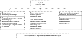 Оперативного планирования производства по месту его выполнения подразделяется на межцеховое и внутрицеховое. Межцеховое осуществляется производственно-диспетчерским отделом предприятия (рис. 3). В функции его входят разработка оперативно-календарных нормативов, взаимная увязка содержания и сроков календарных графиков работы цехов, составление и выдача цехам календарных планов по месяцам, оперативный учет и диспетчирование выполнения календарного плана.