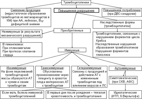 1. тромбоцитопении (идиопатическая тромбоцитопеническая пурпура, повышенное потребление тромбоцитов при ДВС, перераспределение тромбоцитов и их депонирование в селезенке)