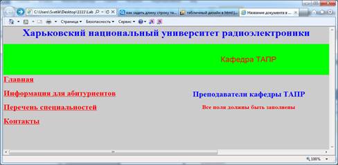Рассмотрим пример, разделения страницы на две колонки/ячейки; слева располагаются ссылки красным цветом на другие документы, а в правой ячейке по центру надпись синим цветом (рис. 2.7).