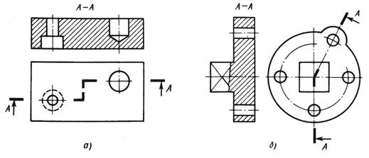 Сложные разрезы обозначают стрелками и заглавными буквами русского алфавита. На рис. 2.4, а изображён сложный ступенчатый разрез. Выполняется так, как будто сделан одной плоскостью, без каких либо линий в месте ступеньки. Секущие плоскости обозначены толстой разомкнутой линией. На рис 2.4, б сделан сложный ломаный разрез фланца с условным поворотом верхней части до плоскости разреза. На рисунке видно, что цапфа, не имеющая внутри отверстия, не штрихуется. Разрез ограничен тонкой волнистой линией.