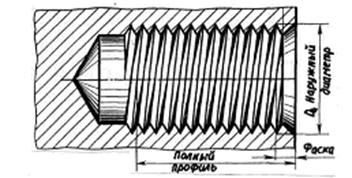 Границу нарезанного участка показывают сплошной толстой основной линией, которую проводят до линии наружного диаметра (рисунок 2.18,а). Границей нарезанного участка (конца резьбы) считают конец профиля резьбы, т.е. до начала сбега.