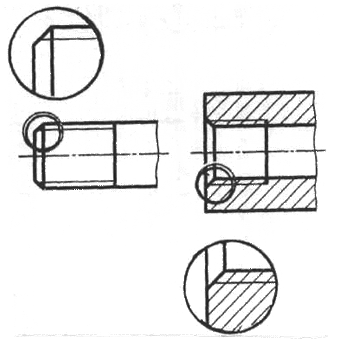 перпендикулярной к оси стержня или отверстия, условно не изображаются (рисунок 2.25). Делается это для того, чтобы сплошная основная линия окружности, изображающая один из диаметров фаски, не закрывала изображения резьбы. Но заметьте, что на изображениях, параллельных оси резьбы (и на видах и на разрезах), сплошная тонкая линия, изображающая один из диаметров резьбы, обязательно должна пересекать фаску, как показано на рисунке 2.25. При этом на стержне меньший диаметр фаски меньше внутреннего диаметра резьбы, и наоборот, в отверстии большой диаметр фаски больше наружного диаметра резьбы. Для наглядности эти места на чертеже показаны в кружках в увеличенном масштабе. Коническую резьбу изображают по тем же правилам, что и цилиндрическую (рисунок 2.26а,б).Чтобы определить внутренний диаметр резьбы (для вычерчивания), нужно ее наружный диаметр умножить на 0,85, т.е. d1=0,85d. При необходимой точности размер внутреннего диаметра резьбы берут из соответствующего стандарта. Резьбу с нестандартным профилем показывают со всеми необходимыми размерами и