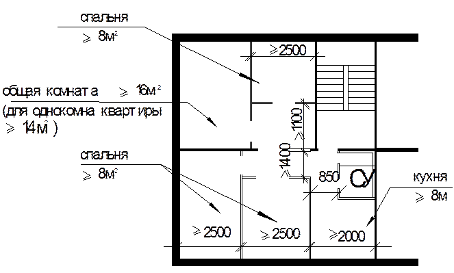 - ширина спален – не менее 2,5 м, общих комнат – не менее 3м;
