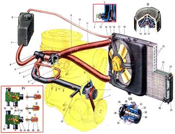 Охлаждение двигателя. 1. Подводящая труба насоса; 2. Шланг отвода охлаждающей жидкости от впускной трубы на подогрев карбюратора; 3. Выпускной патрубок головки блока цилиндров; 4. Патрубок подвода жидкости в радиатор отопителя салона; 5. Шланг отвода жидкости с подогрева карбюратора и впускной трубы; 6. Термостат; 7. Расширительный бачок; 8. Пробка расширительного бачка: 9. Отводящий шланг радиатора; 10. Шланг от расширительного бачка к радиатору; 11. Подводящий шланг радиатора; 12. Датчик температуры охлаждающей жидкости; 13. Головка блока цилиндров; 14. Электродвигатель; 15. Кожух электровентилятора; 16. Левый бачок радиатора; 17. Крыльчатка электровентилятора; 18. Радиатор; 19. Корпус клапанов пробки расширительного бачка; 20. Выпускной клапан пробки; 21. Впускной клапан пробки; 22. Охлаждающие трубки радиатора; 23. Охлаждающие пластины радиатора; 24. Датчик включения и выключения электровентилятора; 25. Правый бачок радиатора; 26. Сливная пробка радиатора; 27. Насос охлаждающей жидкости; 28. Зубчатый ремень газораспределительного механизма; 29. Упорное кольцо сальника; 30. Корпус насоса; 31. Стопорный винт; 32. Подшипник валика насоса; 33. Зубчатый шкив насоса; 34. Валик насоса; 35. Сальник; 36. Крыльчатка насоса; 37. Патрубок подвода жидкости из радиатора отопителя салона; 38. Твердый термочувствительный наполнитель; 39. Резиновая вставка; 40. Поршень рабочего элемента; 41. Входной патрубок (от двигателя); 42. Корпус термостата; 43. Крышка термостата; 44. Входной патрубок (от радиатора); 45. Патрубок термостата, соединенный с расширительным бачком; 46. Основной клапан термостата; 47. Патрубок термостата для подачи жидкости в насос; 48. Перепускной клапан термостата; 49. Держатель; 50. I. Датчик указателя температуры охлаждающей жидкости; 51. II. Пробка расширительного бачка; 52. III. Насос охлаждающей жидкости; 53. IV. Схема работы термостата; 54. А. Температура жидкости выше 102 С; 55. В. Температура жидкости от 87-С до 102С; 56. С. Температура жидкости ниже 87С.
