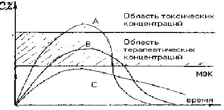 Опыт биофармации показал, что характеристика всасыва-ния лекарственного вещества степенью, в которой оно всасывается, недостаточна. Дело в том, что даже при полном всасывании лекарственного вещества его концентрация в крови может не достигать минимального эффективного уровня, если скорость всасывания невелика по сравнению со скоростью выделения (элиминации) этого вещества из организма. На рис. (рис 5.1.) представлены некоторые из возможных ситуаций, возникающих при введении препаратов А, В, С, содержащих одинаковую дозу одного и того же лекарственного вещества, различающихся примененными в процессе их создания фармацевтическими факторами.