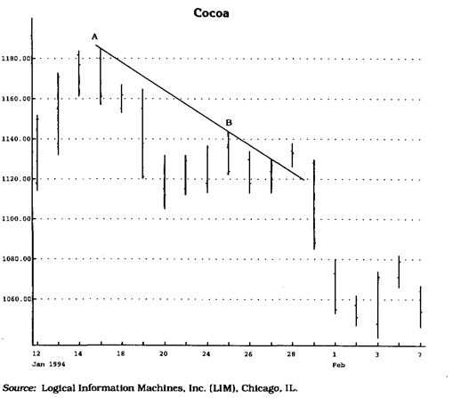 Рис. 1.31 Хотя цены поднялись выше ТО-линяи предложения А-В, на следующий день цена в момент открытия была ниже цены закрытия в день прорыва и затем продолжала падать, опустившись ниже нисходящей линии А-В. Такая динамика цен делает прорыв недействительным.
