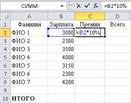 9. Премия рассчитывается в размере 10% от зарплаты сотрудника. Рассчитайте размер премии для каждого сотрудника используя формулу. Например, в ячейке C2 запишите формулу: =В2*10%. Формулы для выполнения четырех арифметических действий удобно задавать двумя способами. 1 способ: ввести формулу полностью с клавиатуры (используется английская раскладка клавиатуры); 2 способ: ввести знак равенства,далее выбрать ячейки участвующие в формуле при помощи мышки, т.е. щелкнуть по ячейке, содержащей первый операнд (В2), нажать на клавиатуре на знак операции (*) и щелкнуть по ячейке, содержащей второй операнд или набрать его на клавиатуре (10%), затем нажать Enter. На рисунке 2 в строке формул показана формула для ячейки C2. Создайте ее первым способом.