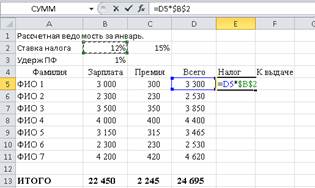 21. Для столбца Налог задайте формулу, в которой используйте значение ячейки В2, поставив знак доллара перед обозначением столбца и перед номером строки ($В$2) как это показано на рисунке 3 (для создания формулы можно ввести знак равенства, щелкнуть по ячейке D5, ввести знак умножения, щелкнуть по ячейке В2 и нажать клавишу F4 ). Это будет абсолютная ссылка на ячейку. При автозаполнении формулы для всех сотрудников адрес этой ячейки останется без изменения.