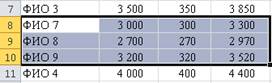 25. Дополните таблицу еще тремя строками, включив их между 7 и 8 строками (приняты три новых сотрудника: фамилиями сокурсников). Заполните эти строки. Фамилии и заработную плату введите (рис.4), а расчетные формулы скопируйте путем тиражирования со строки 7.