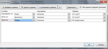 2. Установите курсор в любой ячейке внутри списка. Выберите пункт меню Данные - Сортировка. Отсортируем список сразу по трем ключам: по отделам, внутри отдела по должностям, для одинаковых должностей сортировка продолжится по фамилиям, как показано на рисунке 19.