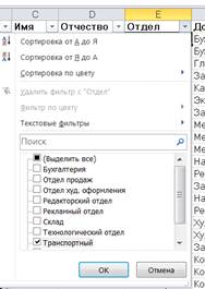 4. С помощью встроенного фильтра отобразите список сотрудников транспортного отдела, как показано на рисунке 20.