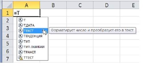 Если Вы знаете имя функции, можно воспользоваться всплывающим списком, который появится, если после символа равно (=) написать первые буквы имени функции (рисунок 26).