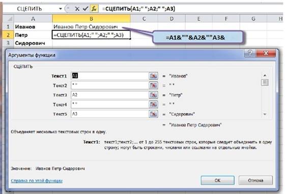 В первом случае функция в ячейке B1 будет выглядеть, как =A1 & " " & A2& " " & A3, во втором случае функция в ячейке B2: =СЦЕПИТЬ(A1; " "; A2; " "; A3).