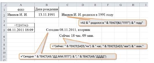 Ранее было также показано, как объединить в одну строку данныетекстовые и даты/времени (см. рисунок 28), в этом случае можно использовать все форматы даты/времени, показанные на рисунке 30.