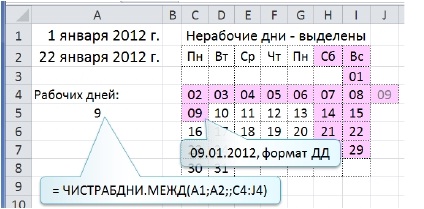 В системе Excel присутствует 4 функции для определения количества рабочих дней в интервале и, наоборот, даты отстоящей вперед или назад на заданное количество рабочих дней: ЧИСТРАБДНИ, ЧИСТРАБДНИ.МЕЖД и РАБДЕНЬ, РАБДЕНЬ.МЕЖД.