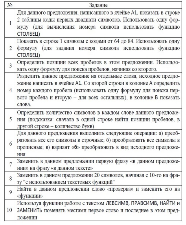 а) Выполнить вариант задания в таблице, соответствующий номеру Вашего компьютера, с использованием функций для работы с текстовой информацией: