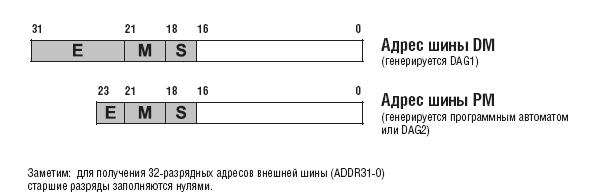 Адреса, генерируемые ADSP_2106x при обращении по шине DM и шине РМ, показаны ниже на рис. 5.4. Адреса шины DM генерируются DAG1, а адреса шины РМ генерируются программным автоматом ADSP_2106x (для команд) или DAG2 (для данных).
