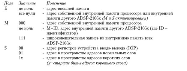 Устройство ввода_вывода проверяет адреса всех обращений к памяти и направляет их в соответствующее пространство памяти. Поля адреса E (внешний), M (многопроцессорный) и S (внутренний) декодируются устройством ввода_вывода, как показано ниже. Если поле E нулевое, то поля М и S станут активными и будут декодироваться.