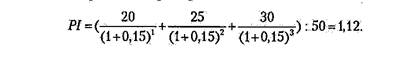 1. С его помощью можно оценить меру устойчивости проекта. Действительно, если PI проекта равен, допустим, 2, то рассматриваемый проект перестанет быть привлекательным для инвестора лишь в том случае, если его выгоды (будущие денежные поступления) окажутся меньшими более чем в 2 раза (это и будет запас прочности проекта).