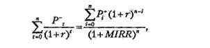 Этот метод предполагает, что положительные денежные потоки проекта реинвестируются по ставке наиболее выгодного размещения средств (что в отличие от метода IRR реалистичнее), а все отрицательные значения потока дисконтируются по той же ставке. Показатель MIRR всегда имеет единственное значение как для ординарного, так и для неординарного потоков. Правила принятия инвестиционных решений по критерию MIRR аналогичны показателю IRR. Значение критерия MIRR также сравнивают с требуемой нормой прибыльности (RRR).