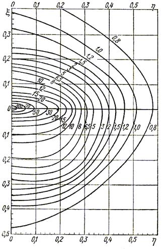 Задается x, кратное высоте мачты или подвеса прожектора x, и выписываются значения x, r, r3 (табл. 6). Находится e по формуле (8). По графику изолюкс на условной поверхности находится h как абсцисса точки, ордината которой равна x, а освещенность e. Вычисляется y по формуле (7), что дает пару точек изолюксы, симметрично расположенной относительно оси x. Последовательно повторяются операции до значения x, при котором необходимая освещенность e, больше ее максимального значения на графике (рис. 8-16).