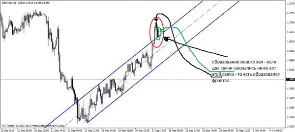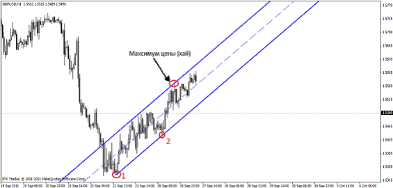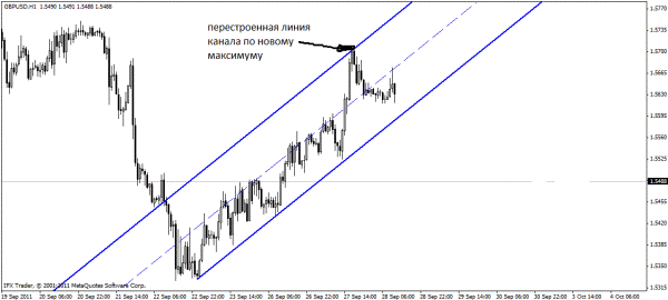 По точкам 1 и 2 проводится линия тренда (линия поддержки или сопротивления), а в точке 3 – параллельно тренду линия канала, проводится по самой высокой (или низкой) цене относительно точки 1. Если дальше сформируется новый максимум, выше предыдущего (точка 3) (новый минимум, ниже предыдущего), то канал соответственно перестраиваем по новой точке:
