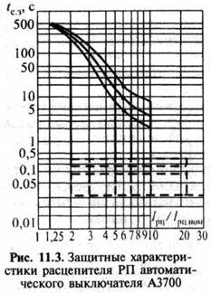 Селективные выключатели снабжаются полупроводниковым, настраиваемым в условиях эксплуатации расцепителем серии РП, обеспечивающим двухступенчатую токовую защиту. Расцепитель селективного автоматического выключателя А3790С содержит все три ступени токовой защиты. При токах более 20 кА он отключается без выдержек времени. Защитные характеристики полупроводникового расцепителя выключателя А3700 показаны на рис. 11.З. Устройство защиты допускает регулировку номинального тока расцепителя Iрц.ном. При этом вместе с Iрц.ном изменяется и ток срабатывания Iс.з максимальной токовой защиты (третья ступень), так что при любом Iрц.ном выполняется условие Iс.зII = 1,25 Iрц.ном. Непосредственно ток Iс.зIII в условиях эксплуатации не регулируется. Коэффициент возврата реле составляет 0,97-0,98. В отличие от максимальной токовой защиты у токовой отсечки с выдержкой времени (вторая ступень) имеется возможность устанавливать несколько значений тока срабатывания.