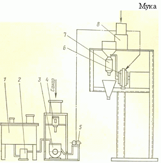 Станция непрерывного сбивания бисквитного теста (рис. 1) работает следующим образом. Меланж загружают в емкость с сеткой 1, откуда насосом-дозатором НШ-20К 2 процеженный меланж непрерывно дозируется в смеситель 3. Над смесителем установлен шнековибрационный дозатор сахара 4. Непрерывно поступающие в смеситель меланж и сахар перемешиваются и образуют яично-сахарную смесь. Отдозированная яично-сахарная смесь поступает по изогнутой трубе в насос ЭШФ 5. В колено изогнутой трубы вмонтирована труба меньшего диаметра с вентилем для раздельной подачи воздуха и регулировки его количества. Насос высокой производительности ЭШФ наряду с яично-сахарной смесью засасывает атмосферный воздух, который по трубопроводу поступает в сбивальную камеру эмульсатора 6; сбитая яично-сахарная смесь подается в вертикальную сбивальную камеру 7, куда с помощью шнековибрационного дозатора 8 подается мука.